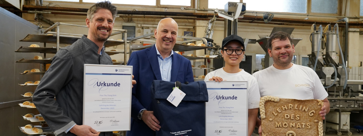 Es gibt Momente, die machen uns als Team einfach richtig stolz – und genau so ein Moment ist das jetzt: Unsere Auszubildende Thu Trang Dinh wurde von der Handwerkskammer Wiesbaden als „Lehrling des Monats“ ausgezeichnet. Eine Ehrung, die Auszubildende mit besonders positiven Eigenschaften, sehr guten Leistungen und spürbarem Engagement hervorhebt.
