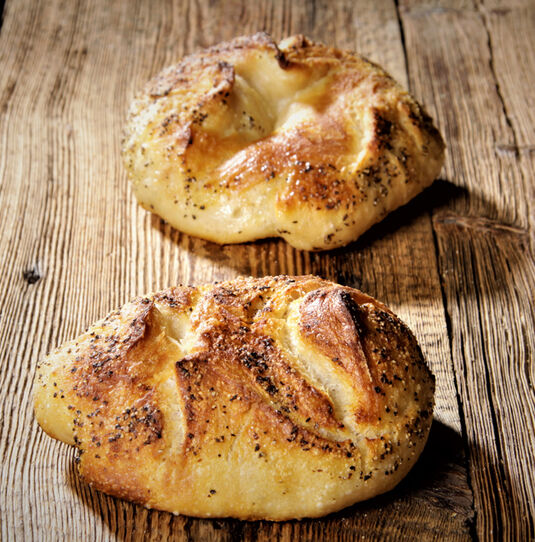 Grobporiges Brötchen aus extra langer Teigruhe mit schwarzem Pfeffer in Meersalz überbacken.