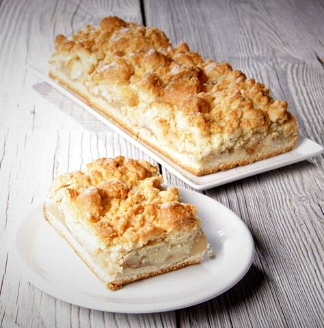 Aus feinporigem Hefeteig, belegt mit saftigen Äpfeln, dekoriert mit Butterstreuseln gebacken.