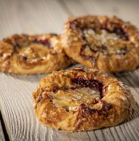 Aus zartblättrigem Plunderteig, gefüllt mit Kirschen, dekoriert mit Butterstreuseln gebacken.