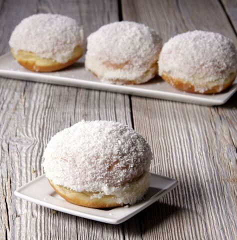 Lockerer Hefeteig in transfettreduziertem Biskin gebacken, gefüllt mit Pflaumenmus in Kokosraspel getaucht.