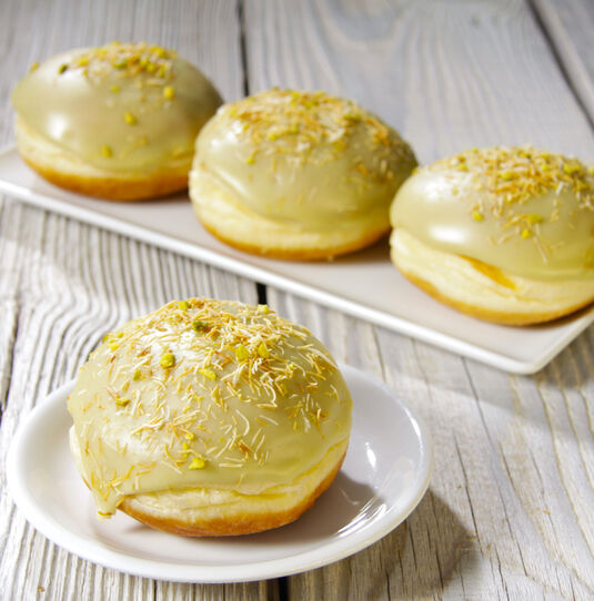 Verschmelzung unseres beliebten Kreppels mit der trendigen Pistazienfüllung. Veredelt mit Pistazien-Fondant, geröstetem Engelshaar und gehackten Pistazien.