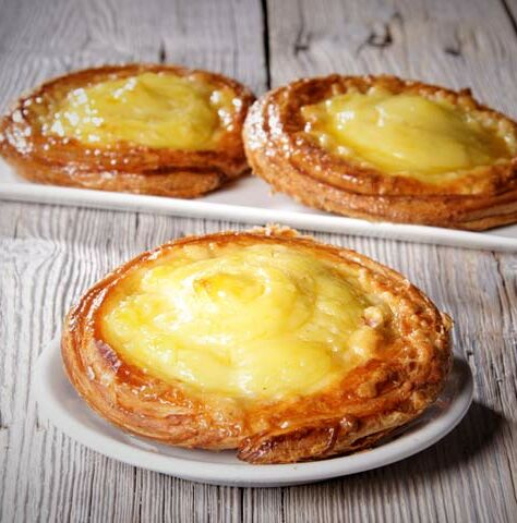 Eine Schnecke aus zartblättrigem Plunderteig mit extra viel Vanillepudding gebacken.