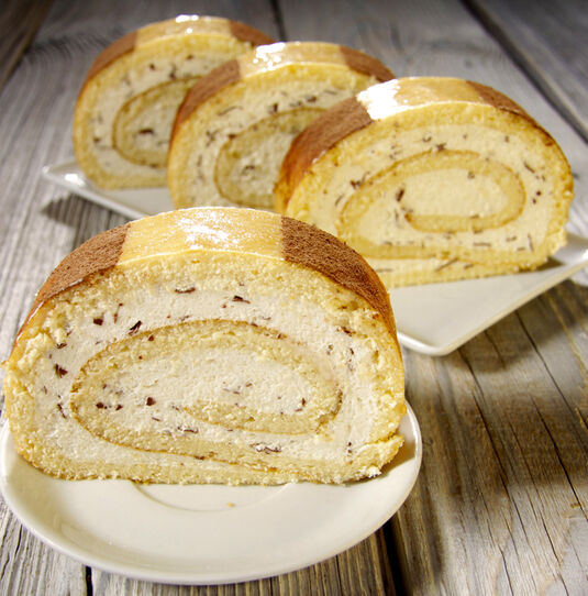 Lockere Biskuitrolle mit süßer Bananensahne gefüllt. Erfrischender Kuchen zum Kaffeekränzchen.