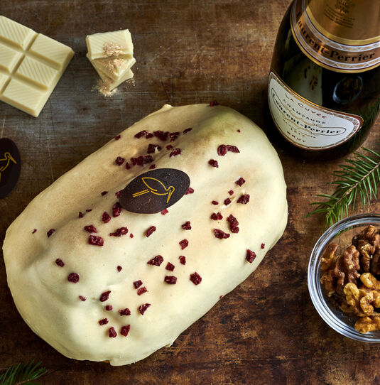 Handverlesene Walnüsse und Rosinen baden in Laurent-Perrier Champagner. Nach dem Backen gibt es eine Champagnerdusche für den Stollen bevor er mit weißer Kuvertüre überzogen wird. Durch die getrockneten Himbeeren und einem Hauch Goldstaub ist er ein echter Blickfang!