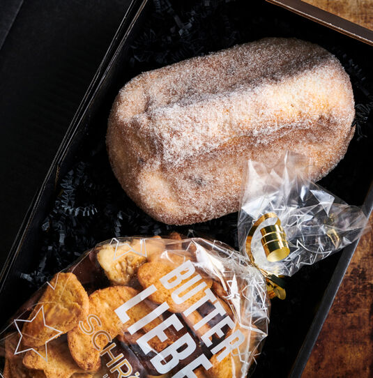 Butterstollen und Plätzchen - das perfekte Doppel für Ihren Adventstisch! Das Schneeweiß Paket beinhaltet einen saftigen Stollen aus Butterhefeteig mit in Rum eingelegten Rosinen, Mandeln sowie hochwertigem Zitronat und Orangeat. Dazu gibt es eine Mischung aus Butter-Plätzchen - teils klassisch, teils überraschend anders mit Tonka-Bohne oder karamellisierten Sonnenblumenkernen.
