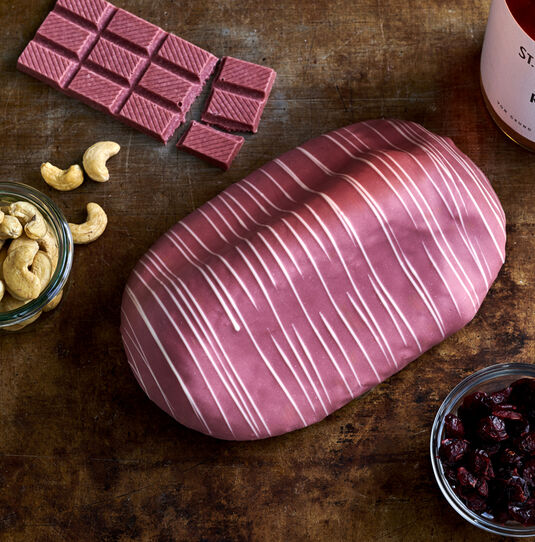 Unser Rosé-Stollen ist mit einer aromatischen Kuvertüre aus Ruby Kakaobohnen überzogen. Durch frische Cashewnüsse und in St. Antony Rosé eingelegte Cranberrys bleibt der Stollen in der ganzen Vorweihnachtszeit wunderbar saftig. Das Geschmacksgeheimnis: Jeder Stollen erhält eine kleine Wellnessbehandlung mit dem Rosé vom VDP.Weingut St. Antony.