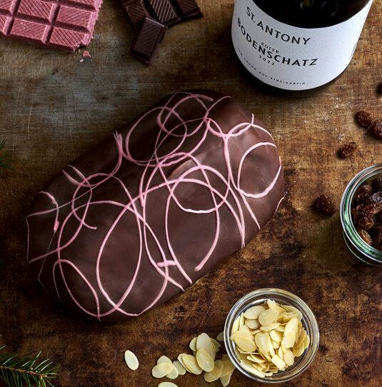 In kirschduftigem Rotwein „Roter Bodenschatz“ vom VDP.Weingut St. Antony eingelegte Rosinen, Zitronat, Orangeat und Mandeln veredeln unseren gehaltvollen Butterhefeteig. Nachdem Backen wird der Stollen mit Rotwein getränkt und mit Zartbitter-Schokolade überzogen.
