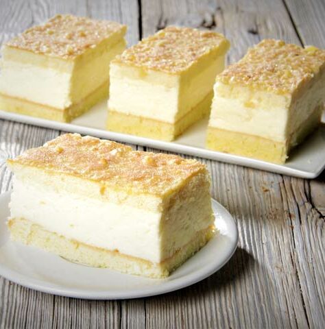 Lockerer Biskuit mit Mandelstückchen gebacken, gefüllt mit locker aufgeschlagener Puddingcreme.