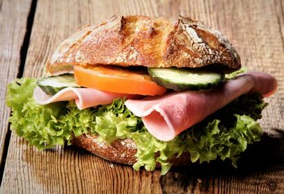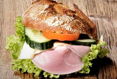 Mehr erfahrenKochschinken mit Salatgarnitur. Das Gebäck auf dem Foto ist ein Muster und nicht beim Belag enthalten.