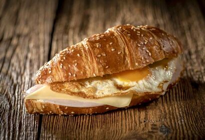 Mehr erfahrenKochschinken und Käse mit Spiegelei. Das Gebäck auf dem Foto ist ein Muster und nicht beim Belag enthalten.