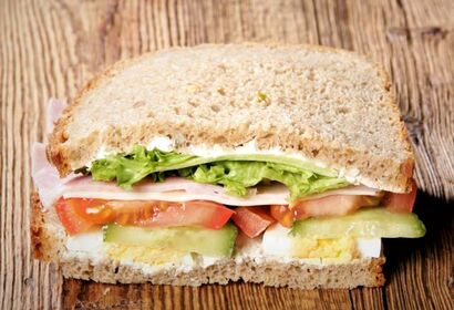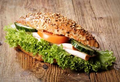 Mehr erfahrenVollkornquarkbrot belegt mit Frischkäse, Salat, Schinken und Käse.