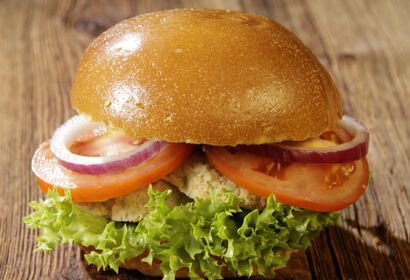 Mehr erfahrenLockere, würzige Frikadelle mit Tomaten, Gurken und aromatischer Burger-Soße. Das Gebäck auf dem Foto…