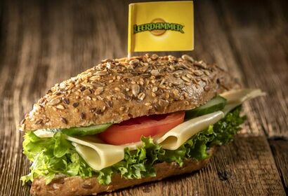 Mehr erfahrenLeerdammer mit Salatgarnitur. Das Gebäck auf dem Foto ist ein Muster und nicht beim Belag enthalten.