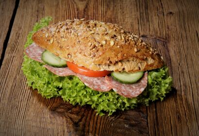 Mehr erfahrenSalami mit Salatgarnitur. Das Gebäck auf dem Foto ist ein Muster und nicht beim Belag enthalten.