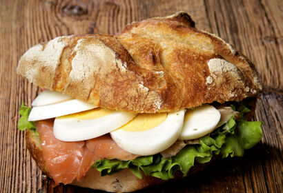 Mehr erfahrenRäucherlachs mit Ei. Das Gebäck auf dem Foto ist ein Muster und nicht beim Belag enthalten.