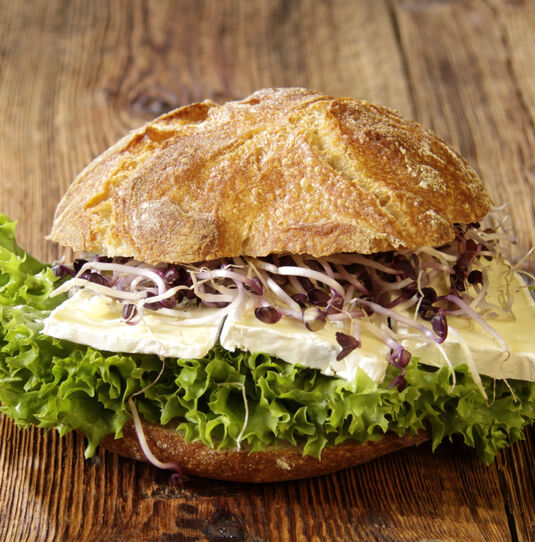 Camembert mit Salatgarnitur. Das Gebäck auf dem Foto ist ein Muster und nicht beim Belag enthalten.