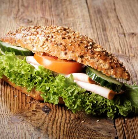 Putenbrust mit Salatgarnitur. Das Gebäck auf dem Foto ist ein Muster und nicht beim Belag enthalten.